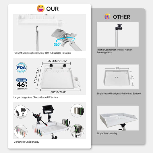 HITORHIKE Boat Cutting Board Bait Table with Stainless Steel Arm, Single Rod Holder, 360° Rotating Surface, Knife & Plier Slots, Drain Channel – Fish Cleaning & Fillet Station for Boats & Grills