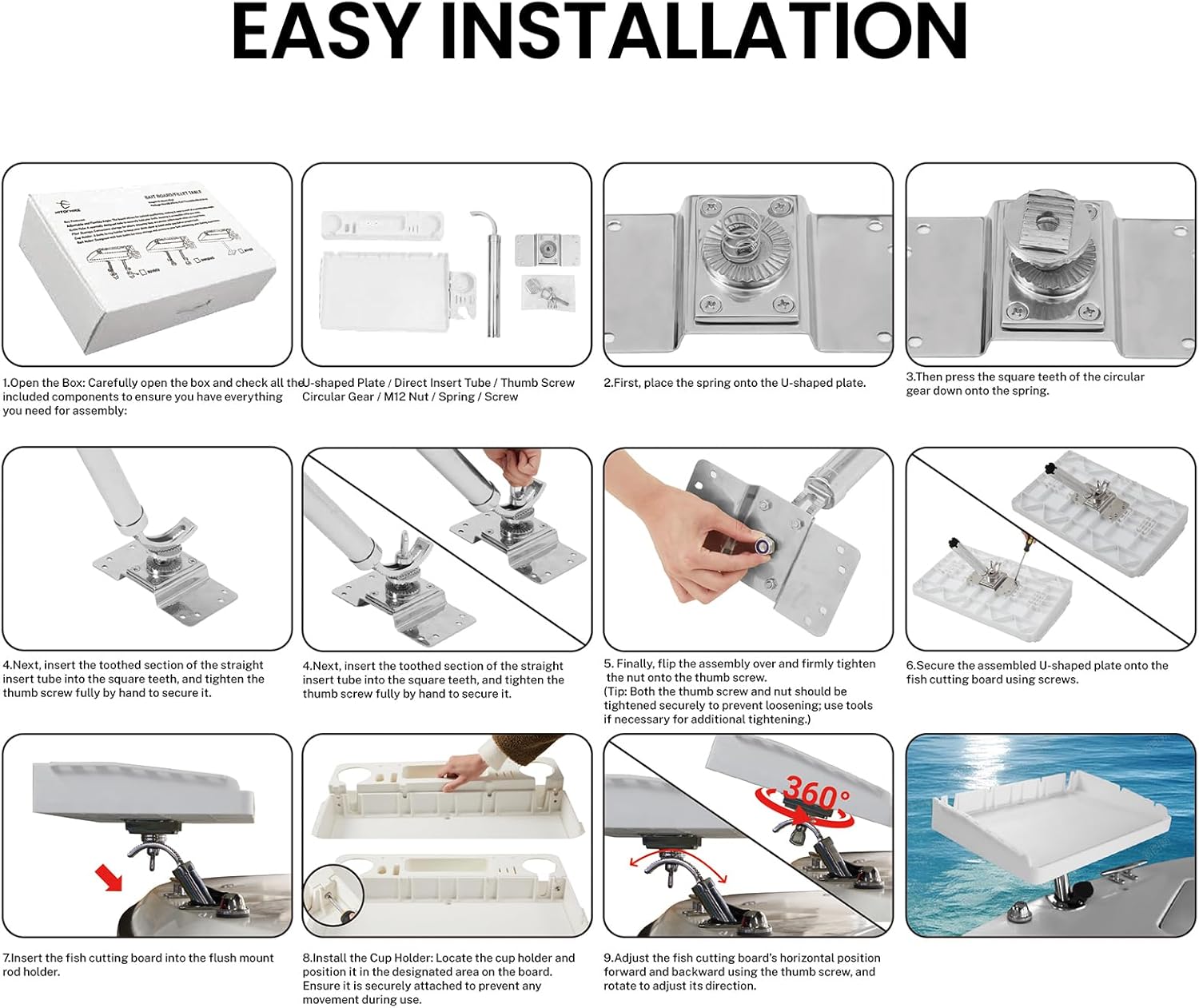 - Complete Set for Easy Installation: This package includes everything you need - a direct insert tube,a cutting board,and all necessary mounting accessories.Perfect for lake and ocean fishing, this set is designed for American anglers seeking convenience and reliability.The direct insert tube, approximately 1.5 inches in diameter, fits most boat mounting holes.Made of ocean-friendly stainless steel, it is rust-resistant and features a 6-hole base for easy angle adjustment.